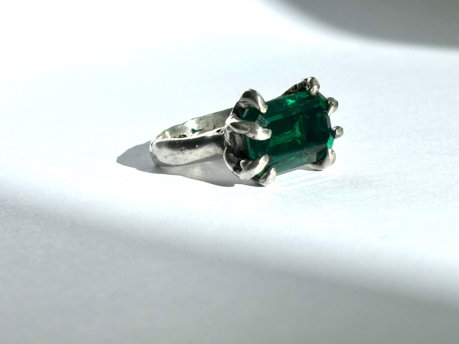 This striking silver ring, crafted through the lost wax casting method, features a bold claw setting that securely holds a vibrant lab-created emerald. The rich green hue of the emerald contrasts beautifully with the cool tones of the silver, creating a piece that is both elegant and dramatic. Perfect for those who appreciate timeless design with a modern edge.