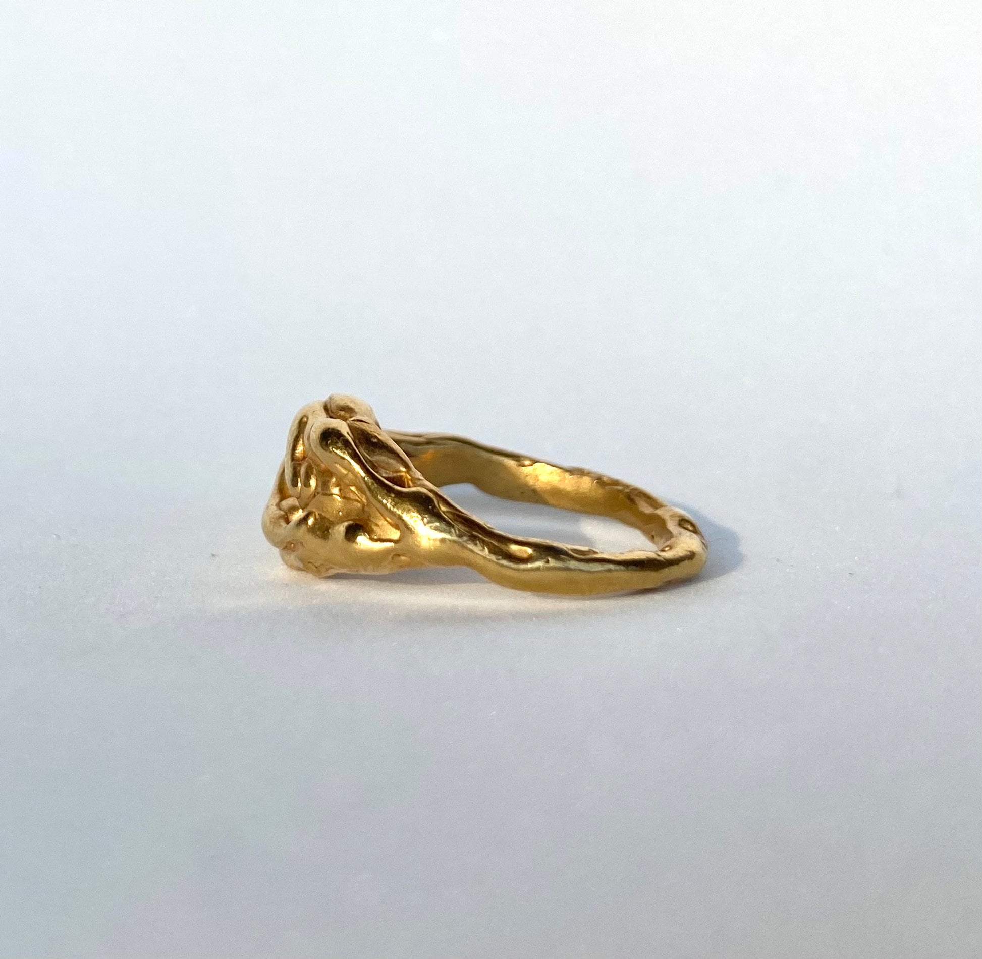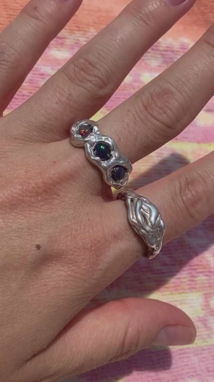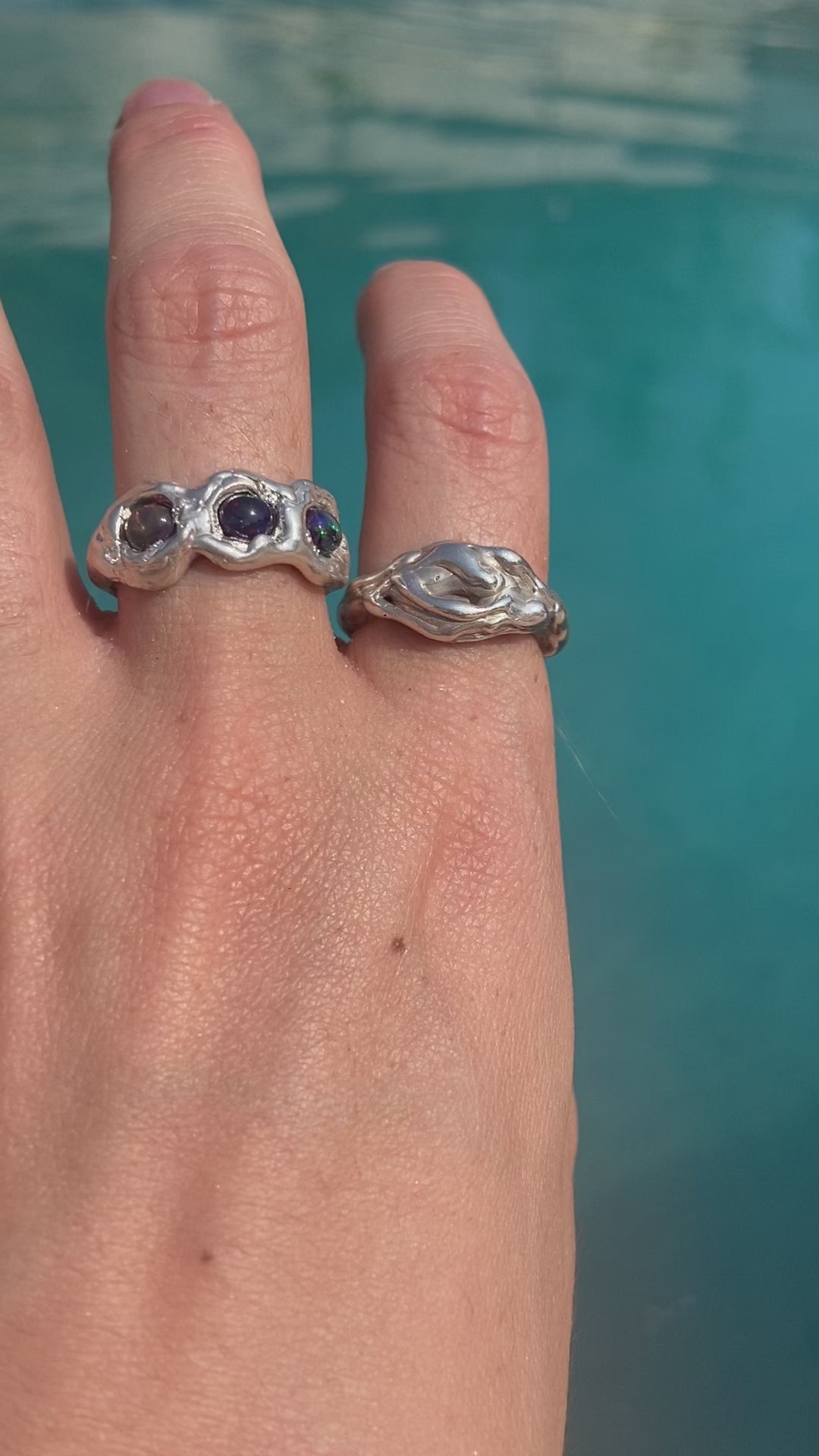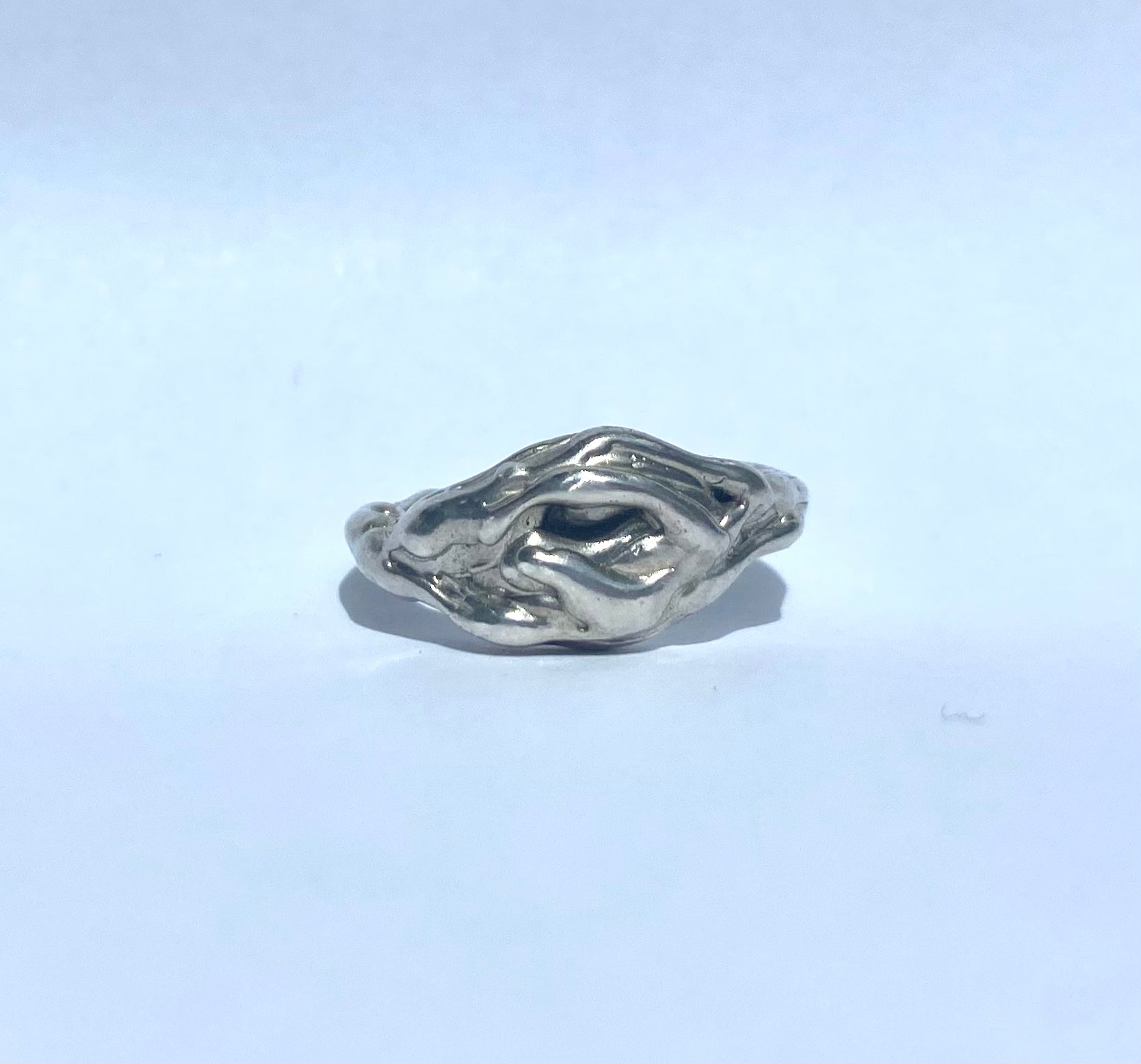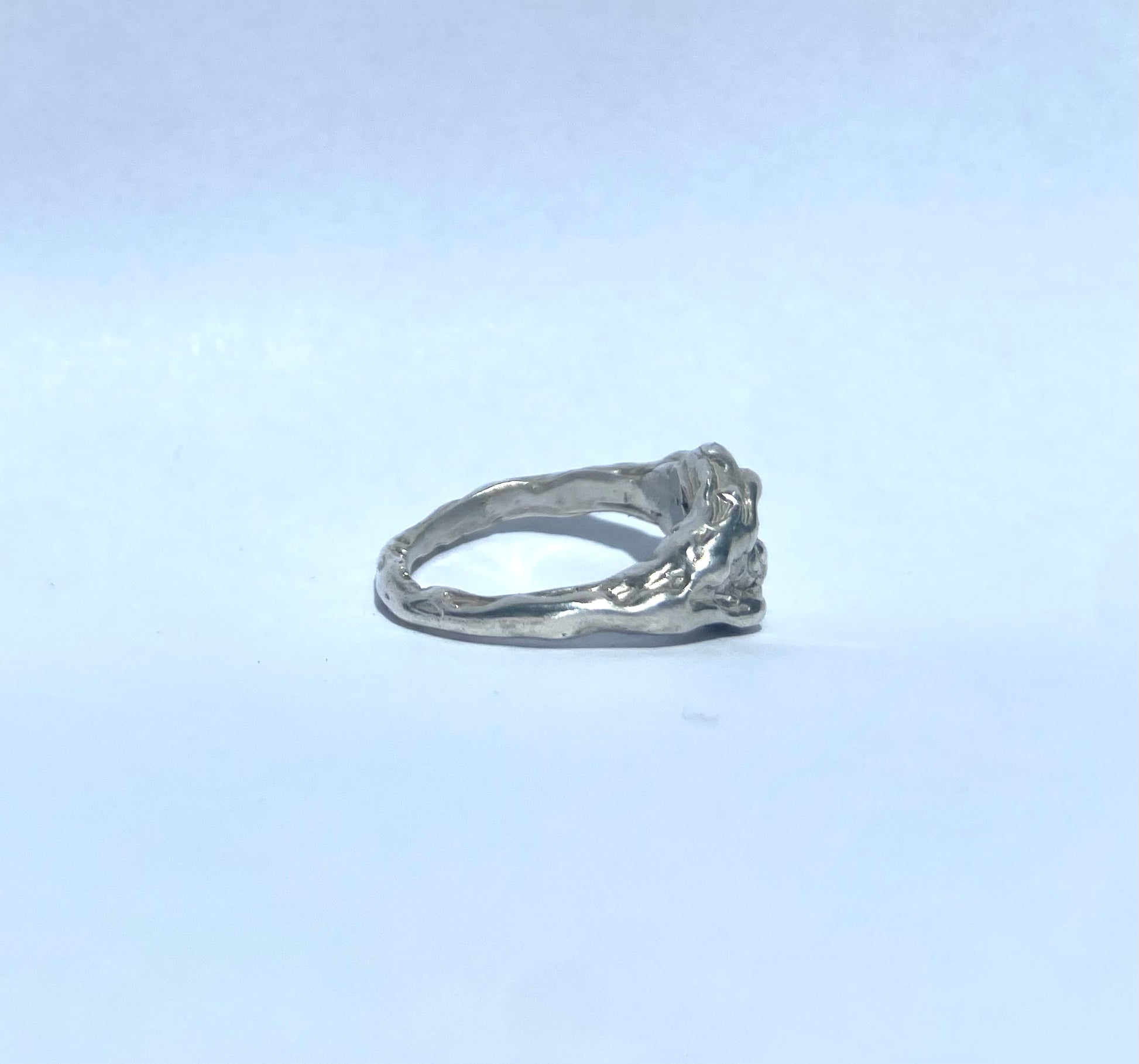 Crafted with an innovative vision, this unique ring is the epitome of artistic expression. Like molten silver cascading and solidifying into a captivating form, this ring captures the essence of fluidity and transformation. Its organic contours and unconventional shape evoke a sense of untamed beauty, reflecting the untamed nature found within Candide's Garden.