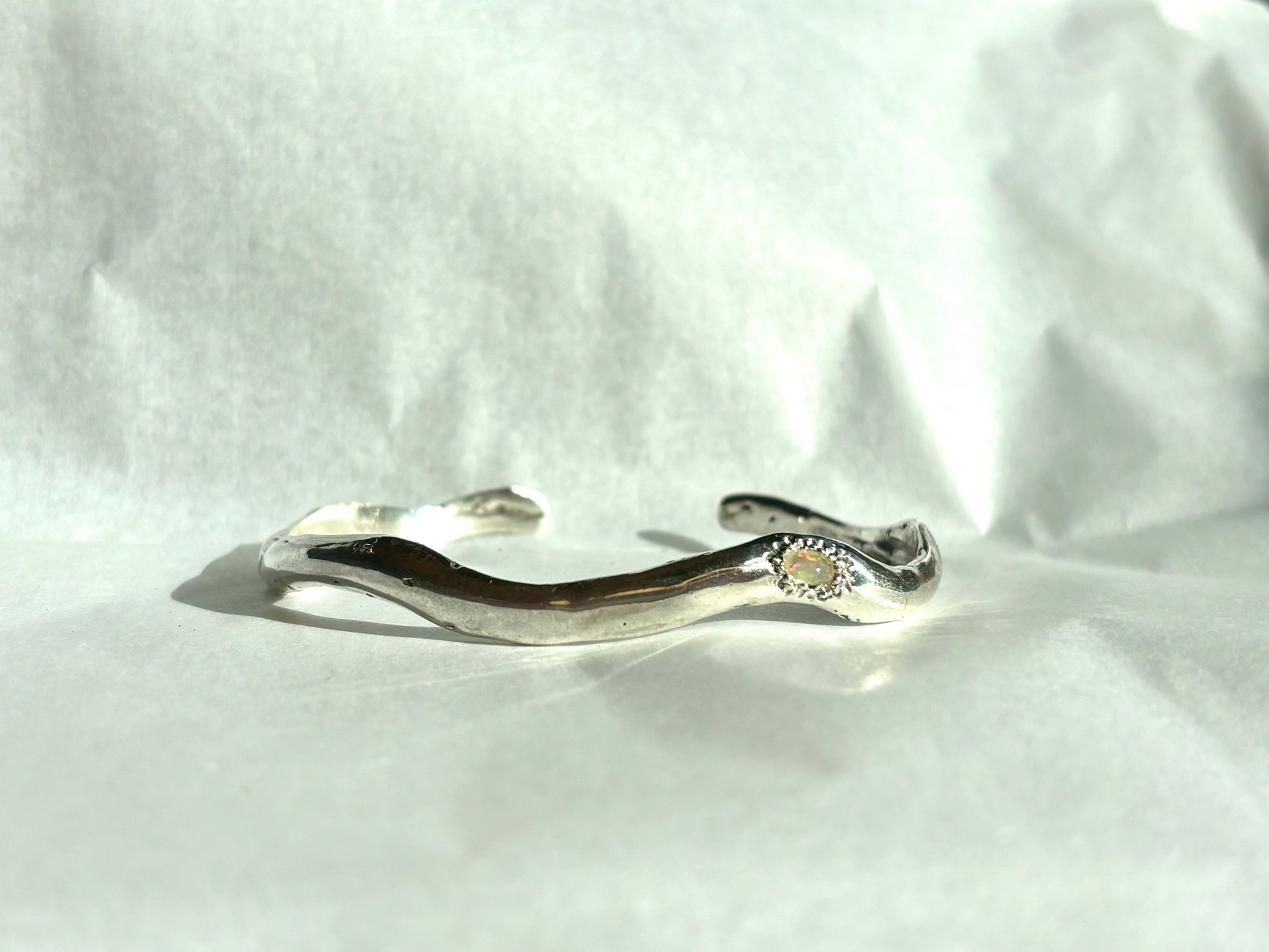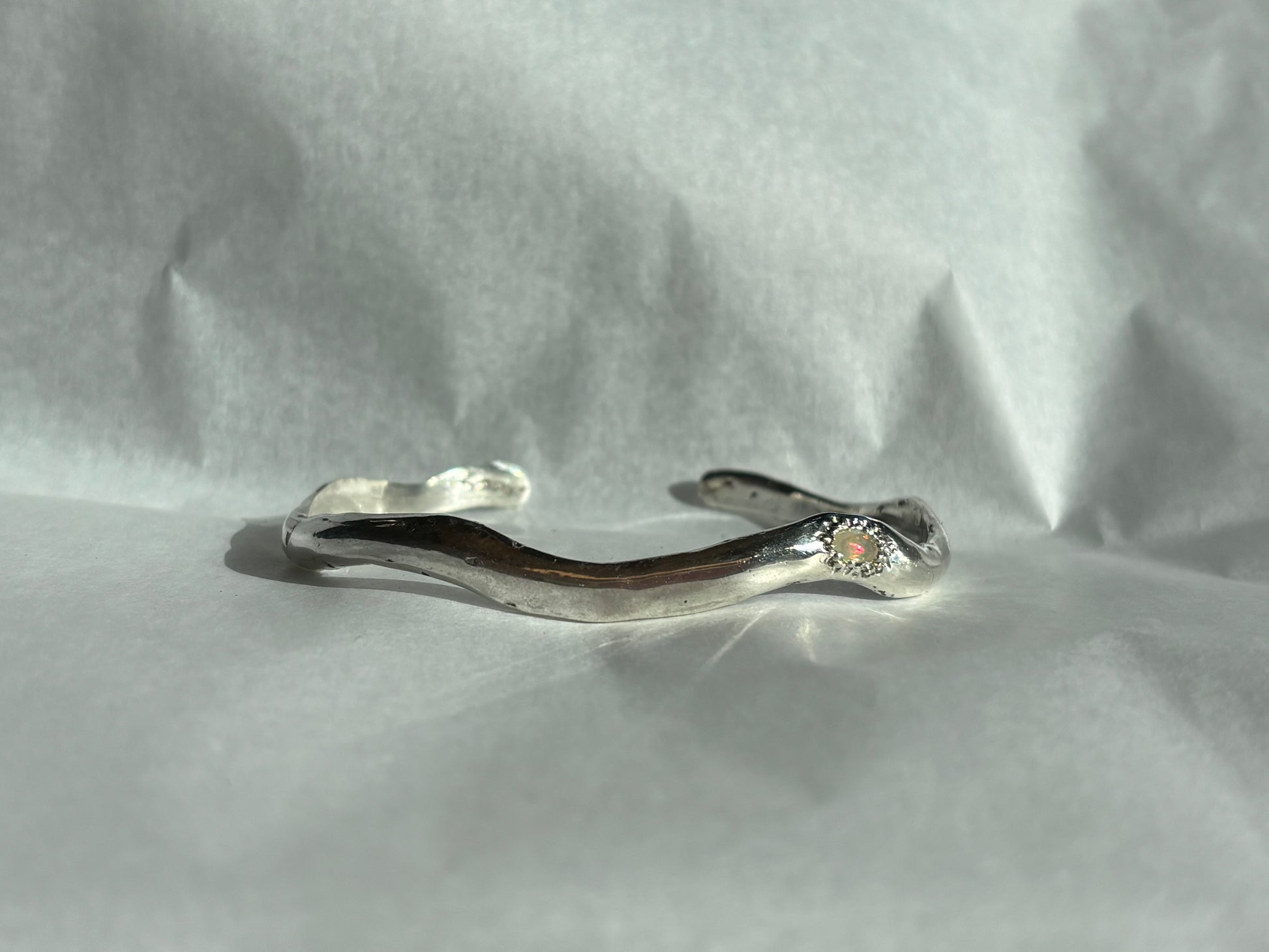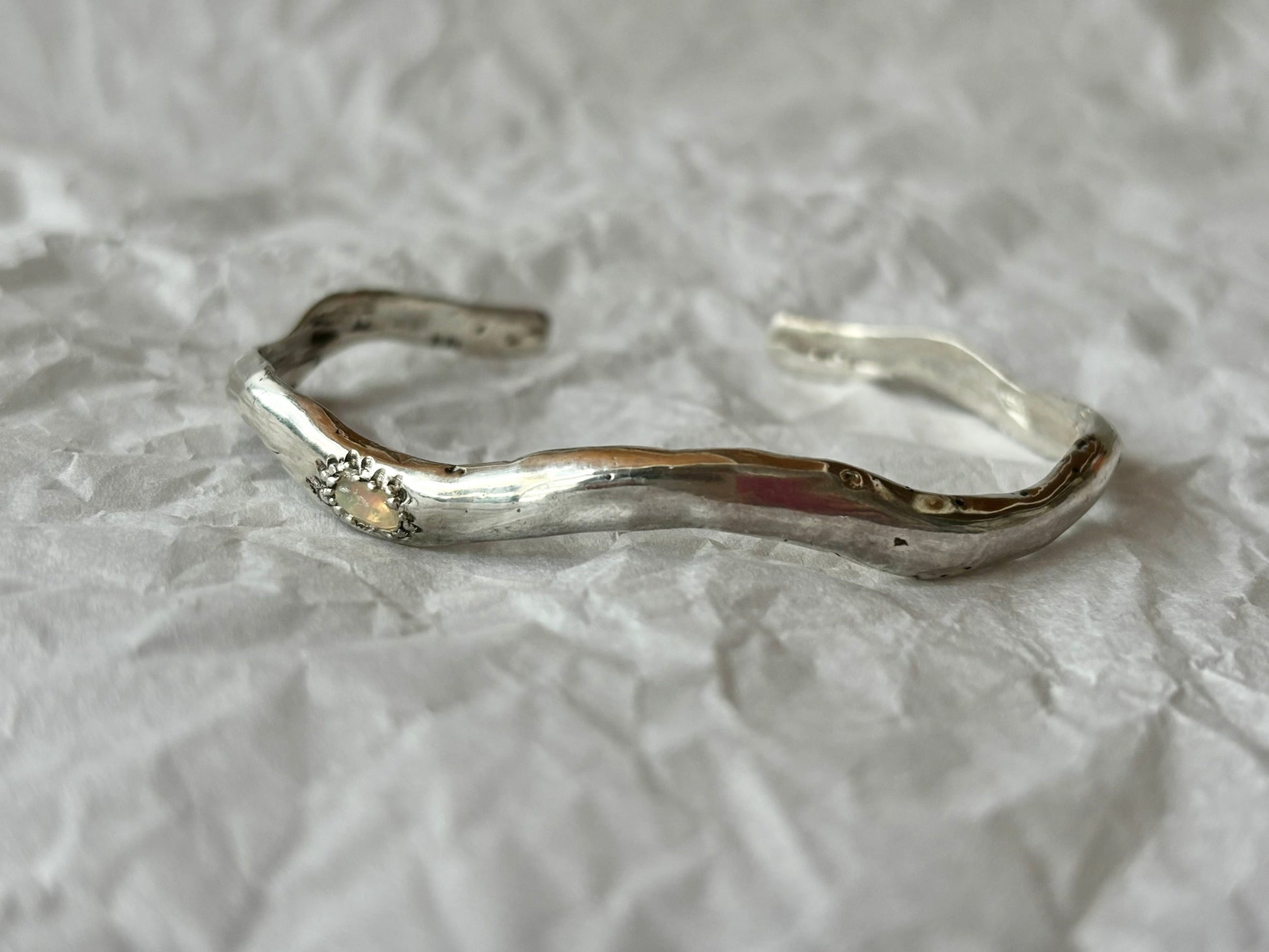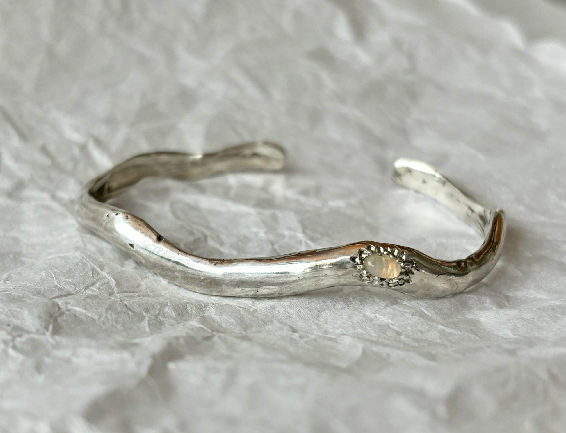 A fluid, wavy silver cuff bracelet set with a luminous natural opal. Its graceful sculptural lines and soft shimmer create an elegant, understated statement piece inspired by organic movement.