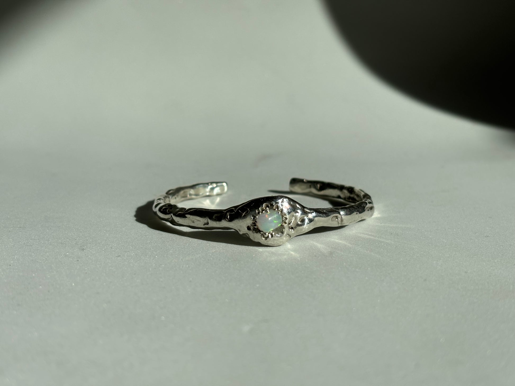 A sculptural silver cuff bracelet featuring a luminous, extra-durable lab opal set at its center. Cast in silver from hand-carved wax, its organic, gently melted texture gives the piece an elegant, understated artistry—refined, modern, and quietly striking.
