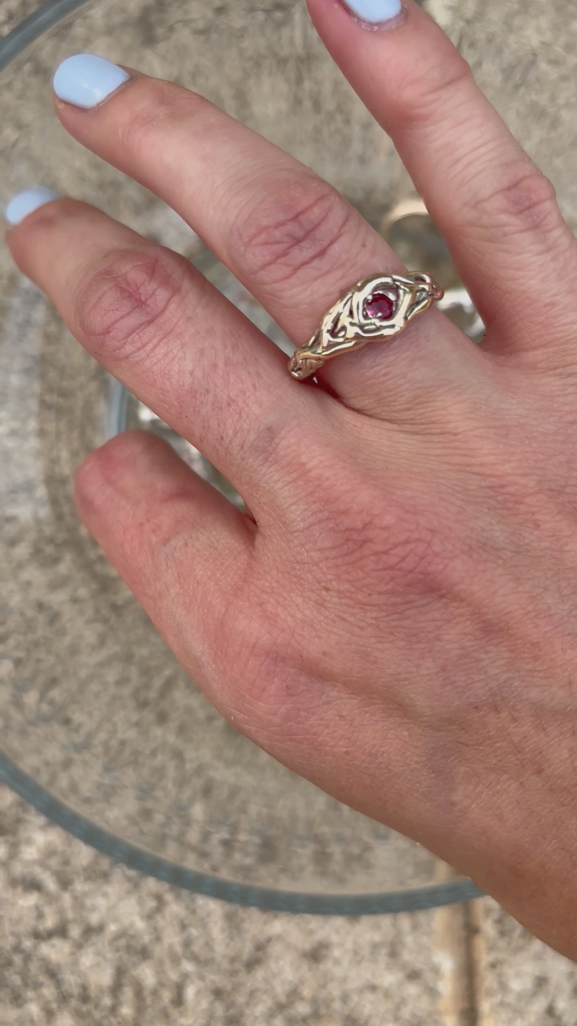 This delicate beauty combines the daintiness of the small round ruby with the melted effect of the gold encapsuling it.